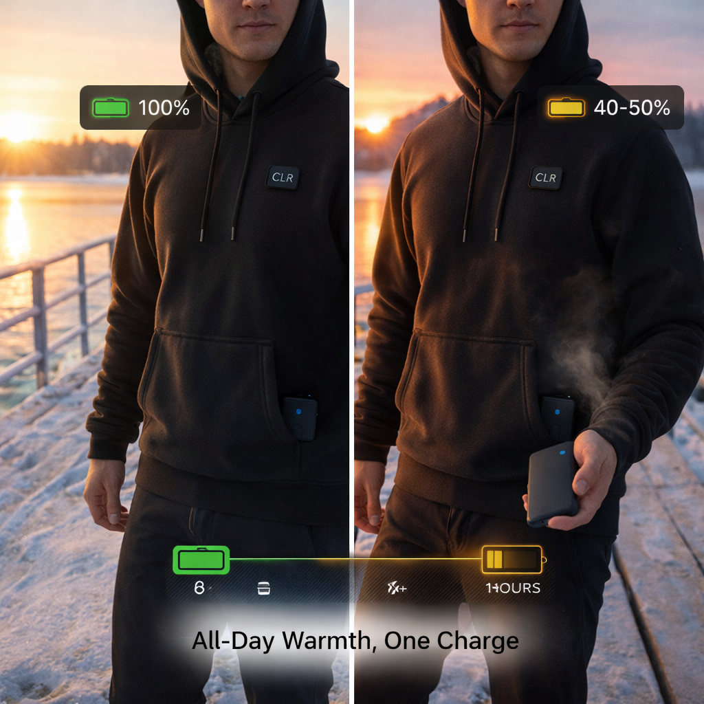 Battery dying halfway through your outdoor plans? Not anymore. While cheap heated hoodies leave you cold after 2-3 hours, our high-density 10,000mAh battery delivers consistent warmth for 8+ hours on medium settings. Customers report lasting "all day" on boat trips and full hiking excursions without needing a recharge. One battery pack means one less thing to worry about when you're out enjoying winter.